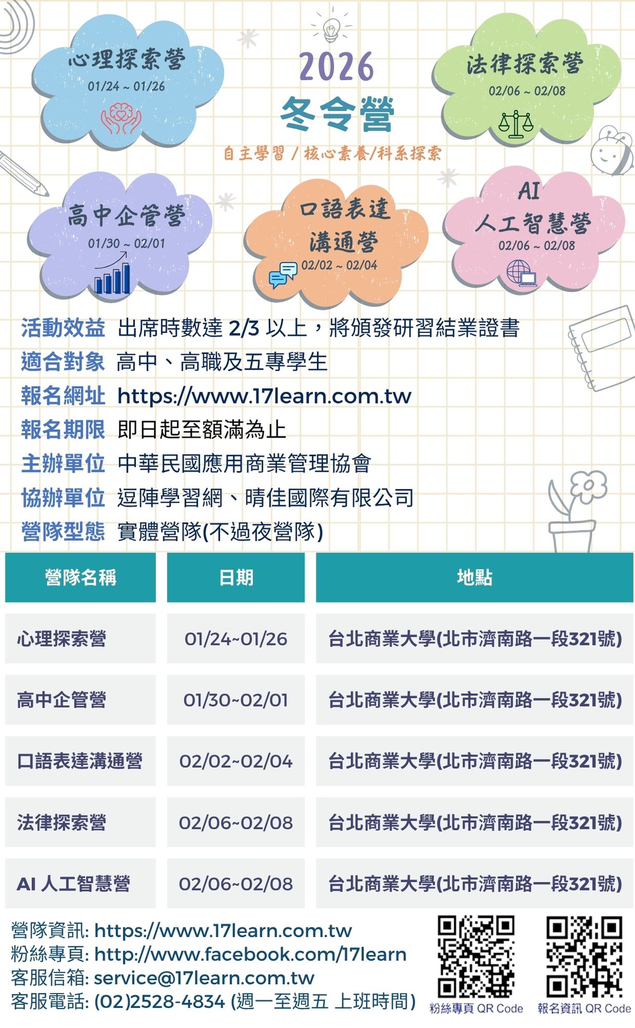 十、有關營隊問題,歡迎函詢課務中心: service@17learn.com.tw,或是私訊粉絲專頁:https://www.facebook.com/17learn