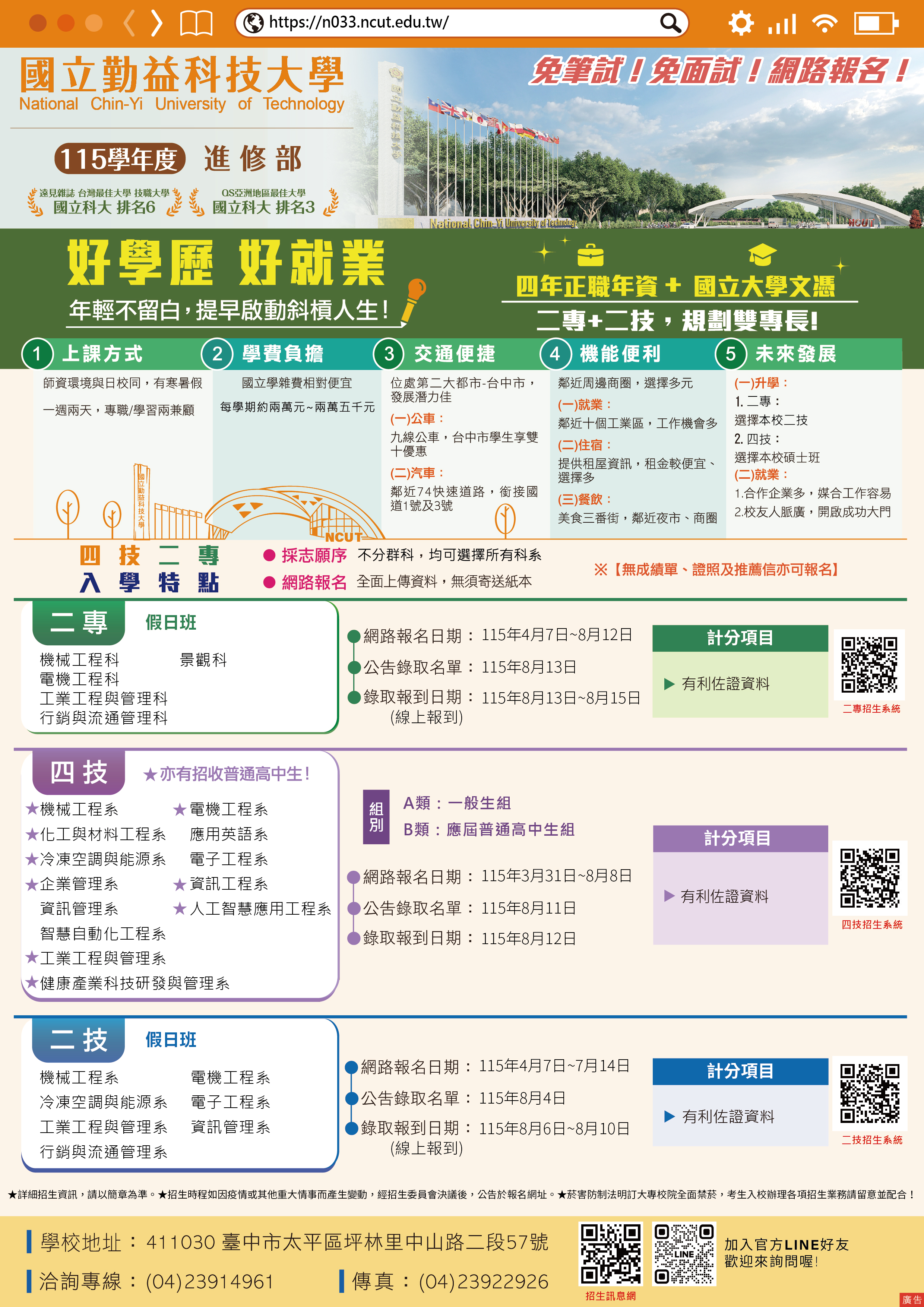 國立勤益科技大學115學年度二專進修部及二技進修部(假日班)獨立招生訊息-海報.jpg